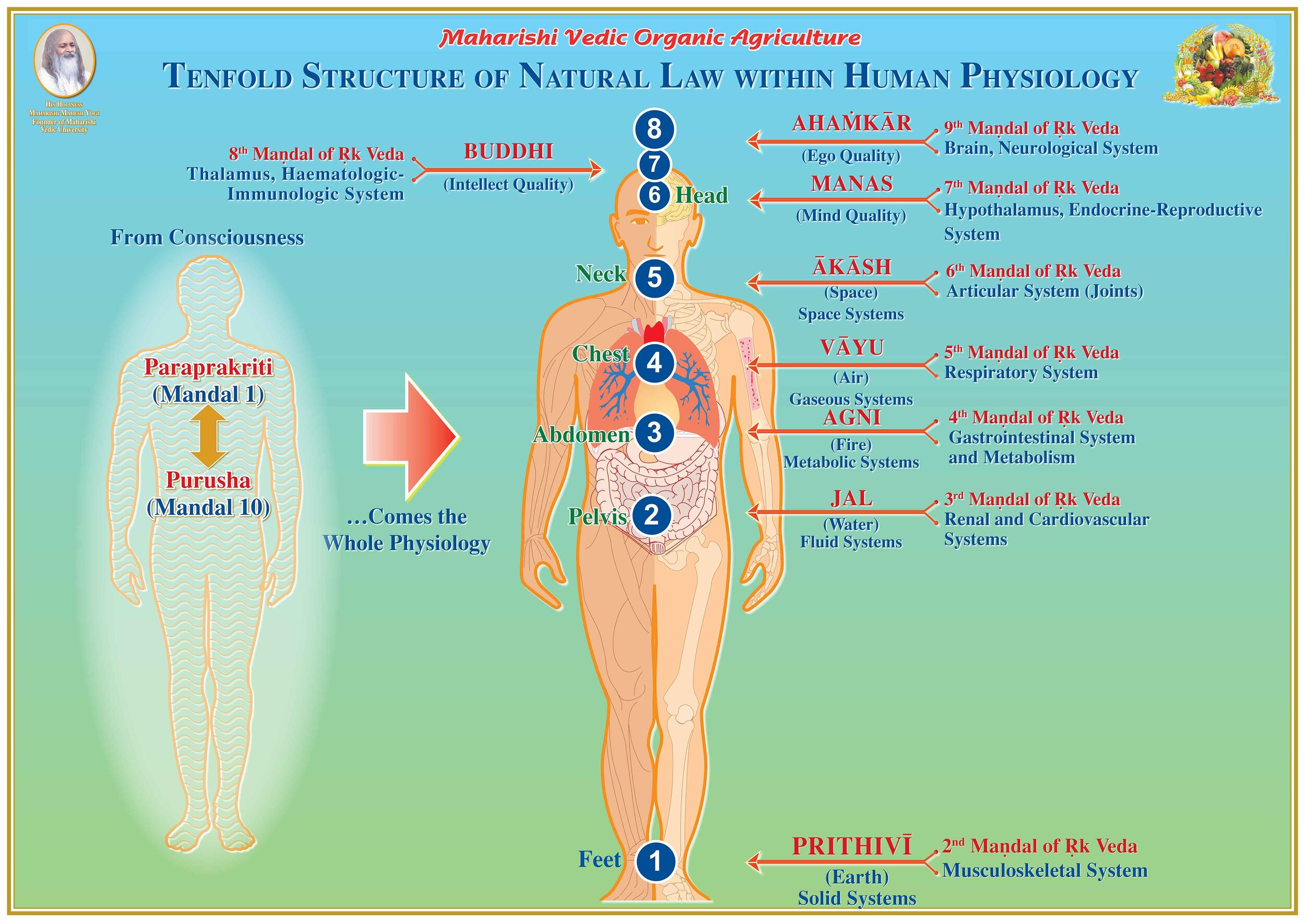 Ego, intellect, mind, space, air, fire, water, and earth comprise the eight प्रकृति (prakriti). From ego, comes intellect. From intellect, comes mind. From mind, comes space. From space, comes air. From air, comes fire. From fire, comes water. From water, comes earth. You'll notice each one gets grosser or denser and the latter is a comment on the former. And so, this is a sequence that is eternal and it just goes on and on and on. And when it goes on in the transcendent it creates a blueprint for creation, and just like a building has a blueprint, all of creation also has a blueprint and that blueprint is responsible for everything that goes on in the universe. So there is this same sequence, over and over again at an ∞ frequency.